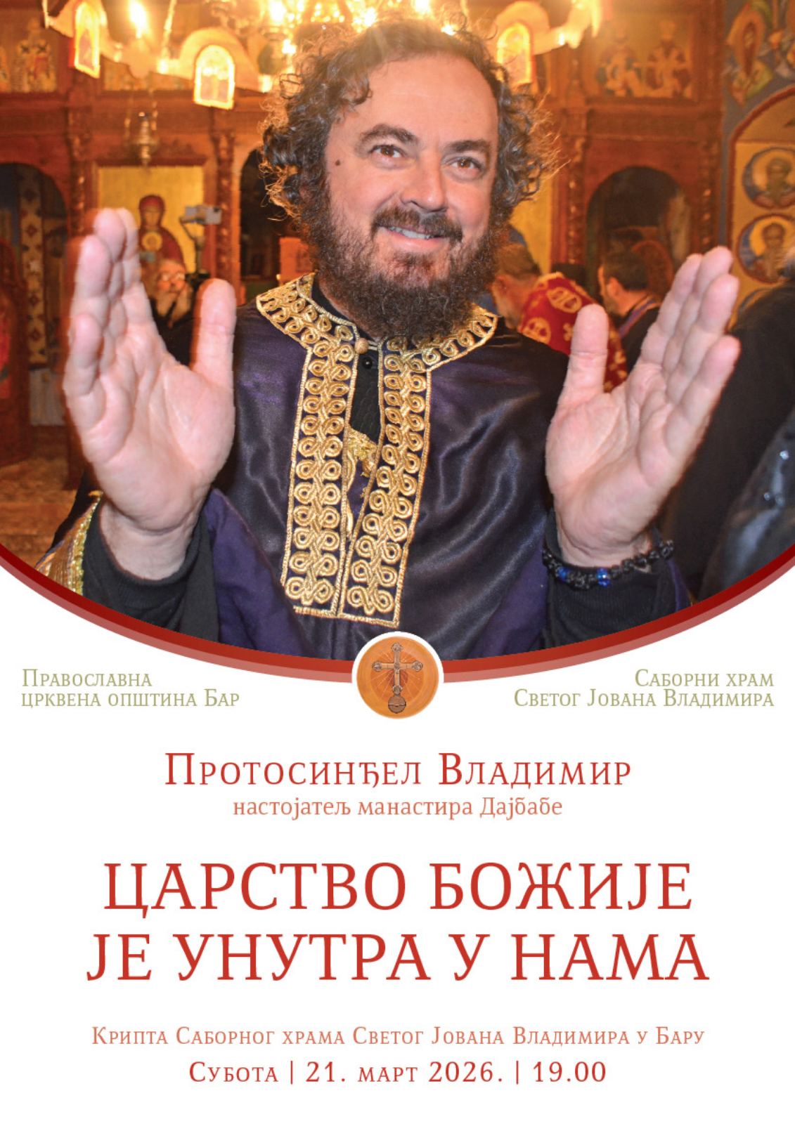 Протосинђел Владимир, настојатељ манастира Дајбабе, одржаће у суботу 21. марта 2026 године предавање на тему „ЦАРСТВО БОЖИЈЕ ЈЕ УНУТРА У НАМА“ Предаваље ће се одржати у крипти Саборног храма Светог Јована Владимира, са почетком у 19:00 часова.