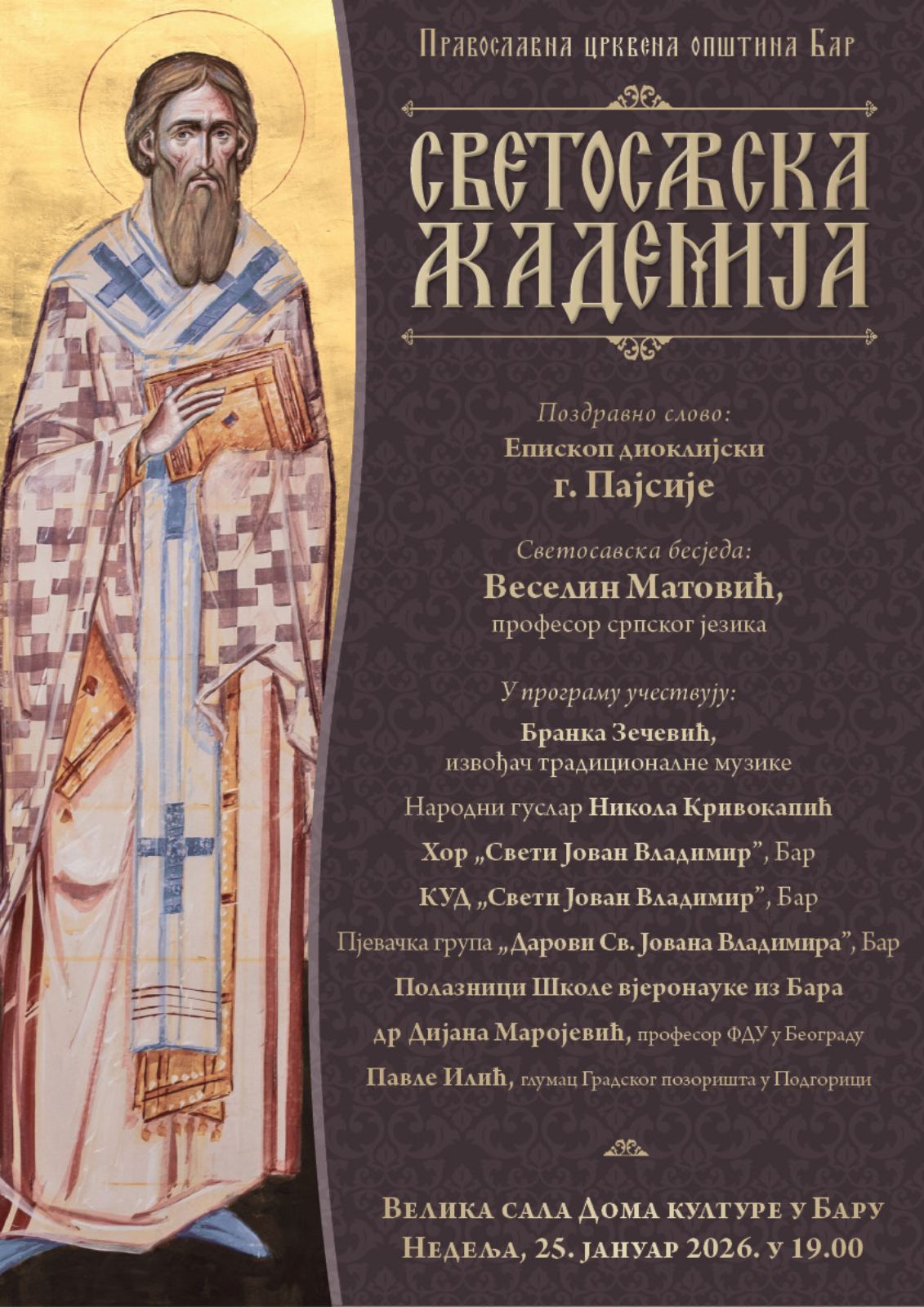 У недељу 25. јануара 2026 године у великој сали Дома културе Бар, у организацији Православне црквене општине Бар, биће одржана Светосавска академија. Програм почиње у 19 часова поздравним словом Епископа диоклијског г. Пајсија. Светосавску бесједу говориће Веселин Матовић, професор српског језика.