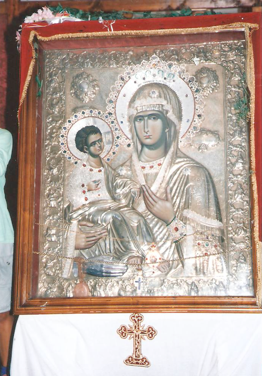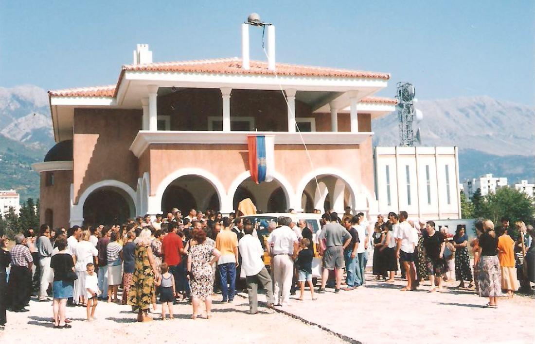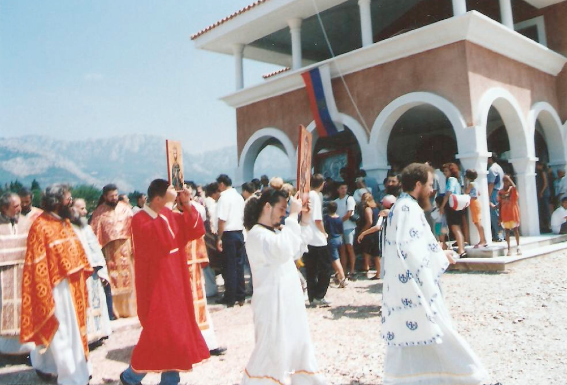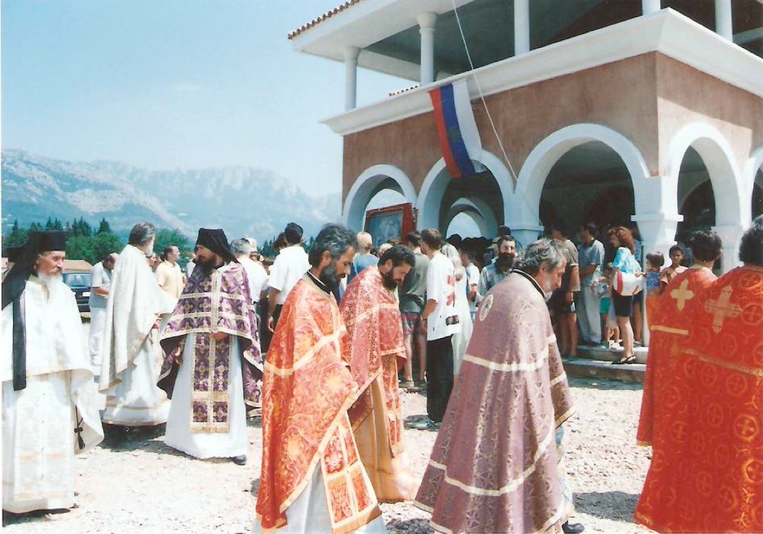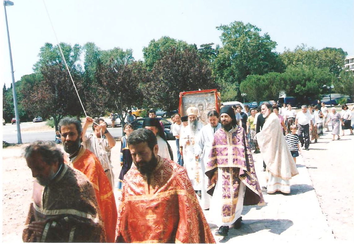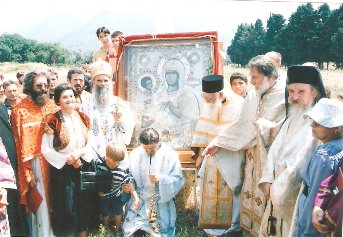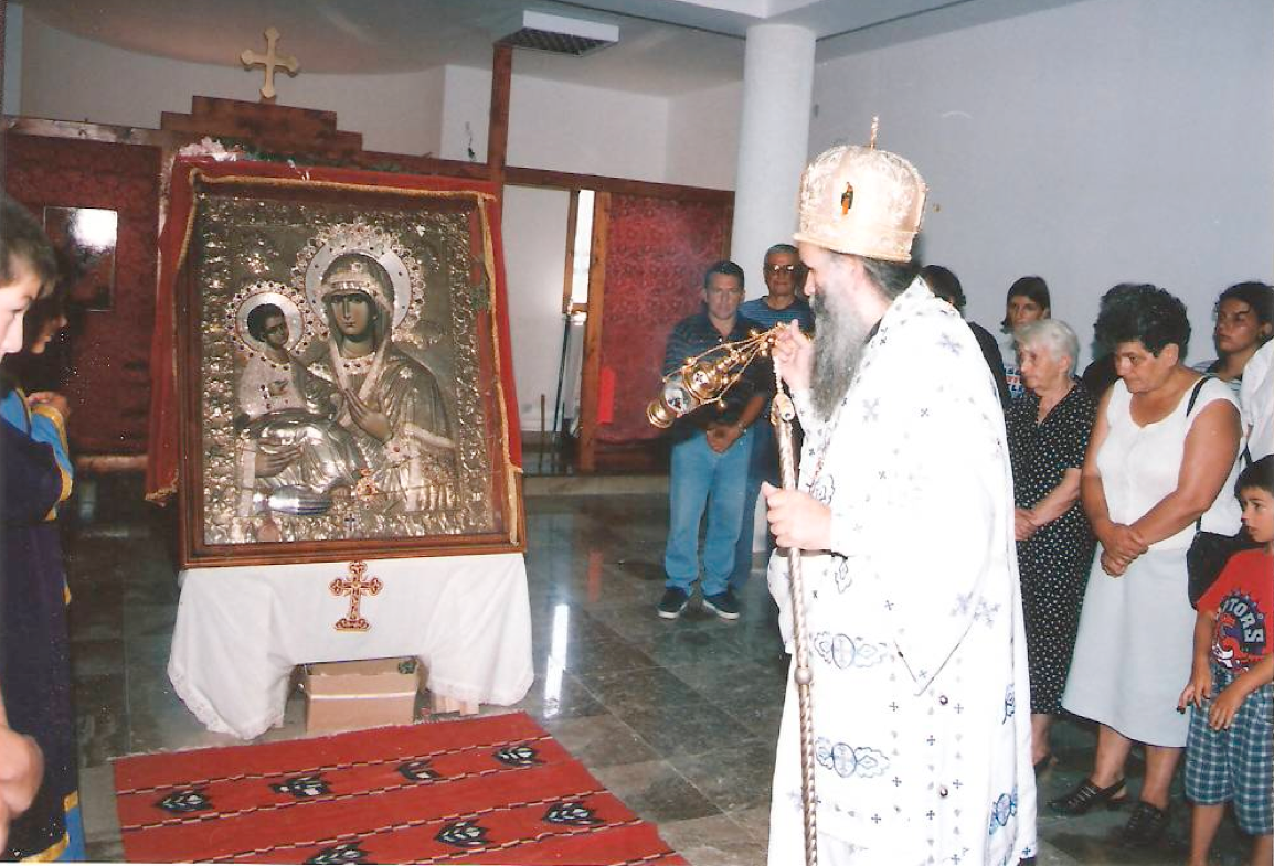 Освећење Парохијског Дома на Тополици 31.07.1998. Тада је у Бару донешена икона Хиландарске Богородице Тројеручице.