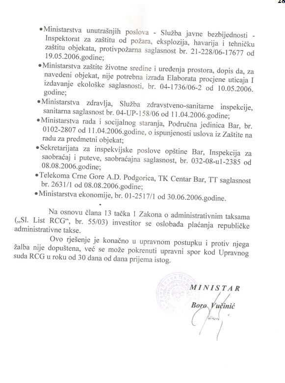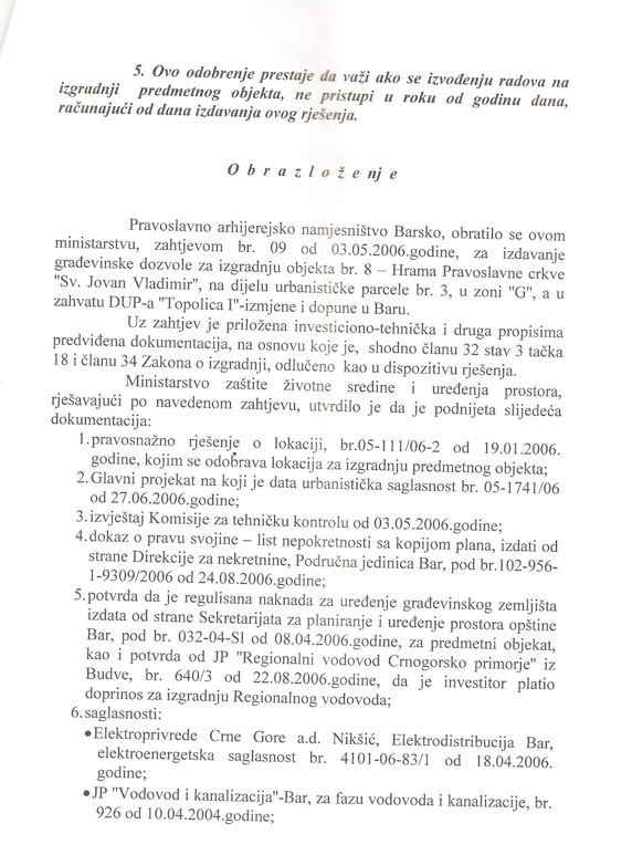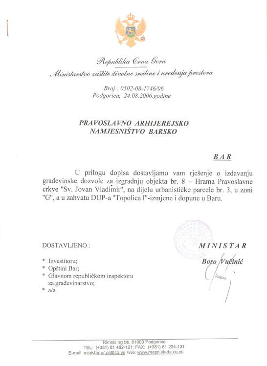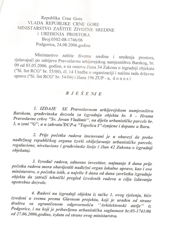 Рјешење о издавању дозволе за изградњу Храма Светог Јованаа Владимира у Бару – издато 24.08.2006.