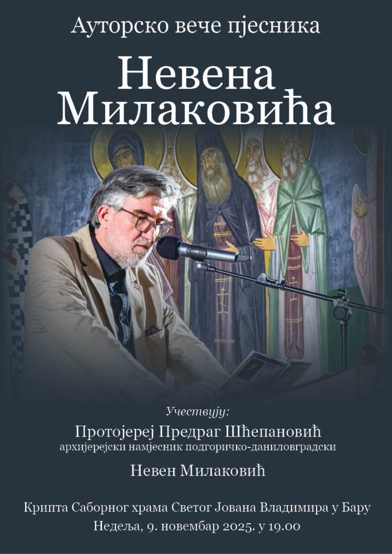 У крипти Саборног храма Светог Јована Владимира у недељу 9. новембра одржано је ауторско вече пјесника Невена Милаковића. Вече је отворио поздравним словом намјесник барски и старјешина Саборног храма Светог Јована Владимира, протојереј-ставрофор Слободан Зековић. Након што је пјесник Невен Милаковић изрецитовао своју пјесму „Очев шамар“, о самом аутору и његовом досадашњем дјелу говорио је архијерејски намјесник подгоричко-даниловградски протојереј Предраг Шћепановић. У наставку вечери, присутна публика могла је да ужива у пјесмама које је за ову прилику одабрао сам аутор.