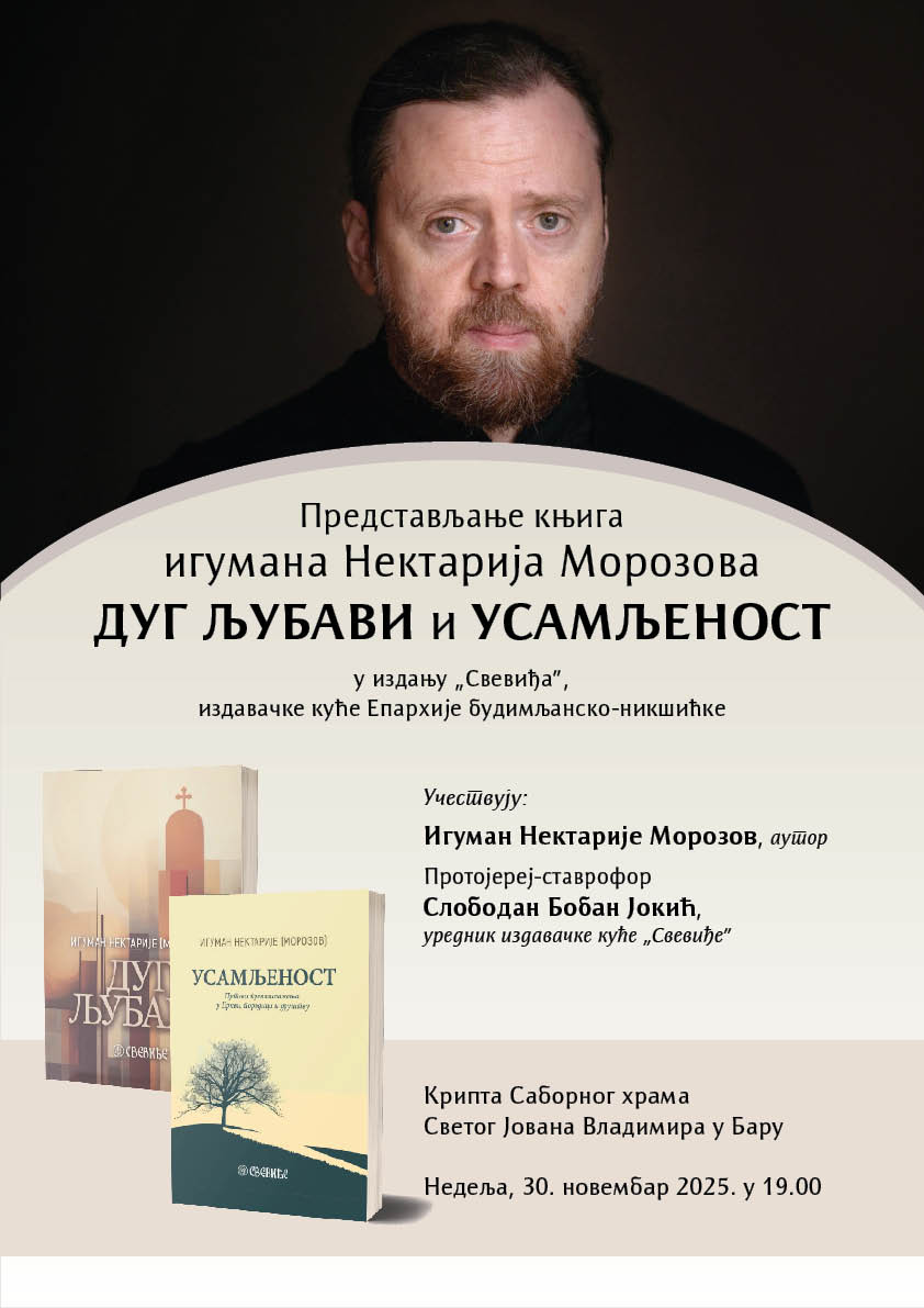 У крипти Саборног храма Светог Јована Владимира у недељу, 30. новембра 2025 године са почетком у 19:00 часова биће представљене двије књиге игумана Нектарија Морозова, старjешинe цркве Светих апостола Петра и Павла у Саратову, „Дуг љубави“ и „Усамљеност“. Књиге је издала издавачка кућа Епархије будимљанско-никшићке „Свевиђе“. О књизи ће поред аутора говорити и уредник издавачке куће „Свевиђе“ протојереј-ставрофор Слободан Јокић.