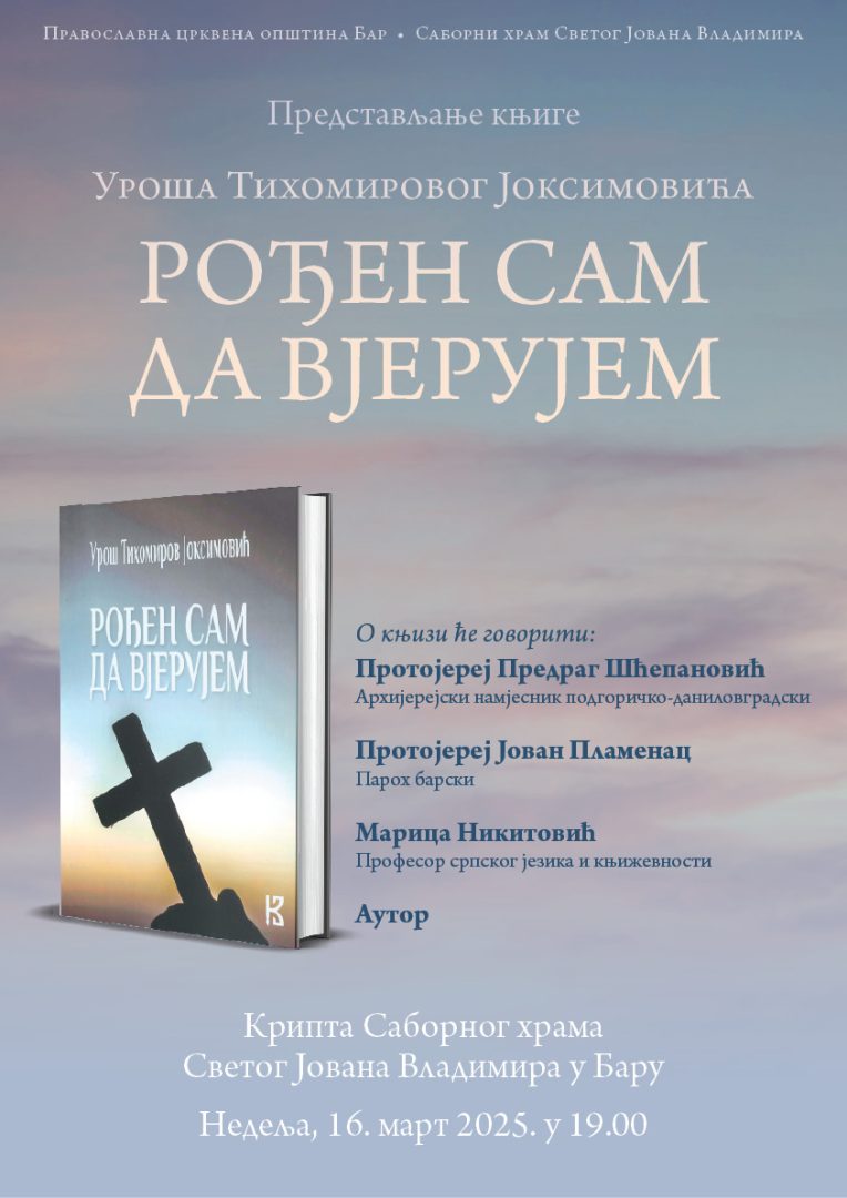 У организацији Црквене општине Бар и храма Светог Јована Владимира, у недјељу 16. марта 2025. године са почетком у 19 часова,у крипти барског храма, одржано је представљање књиге „Рођен сам да вјерујем“ Уроша Тихомировог Јоксимовића. О књизи су говорили протојереј Предраг Шћепановић архијерејски намјесник подгоричко-даниловградски, протојереј Јован Пламенац парох барски, професорица српског језика и књижевности Марица Никитовић, као и сам аутор. Модератор и водитељ био је домаћин протојереј-ставрофор Слободан Зековић парох барски и старјешина храма Светог Јована Владимира.