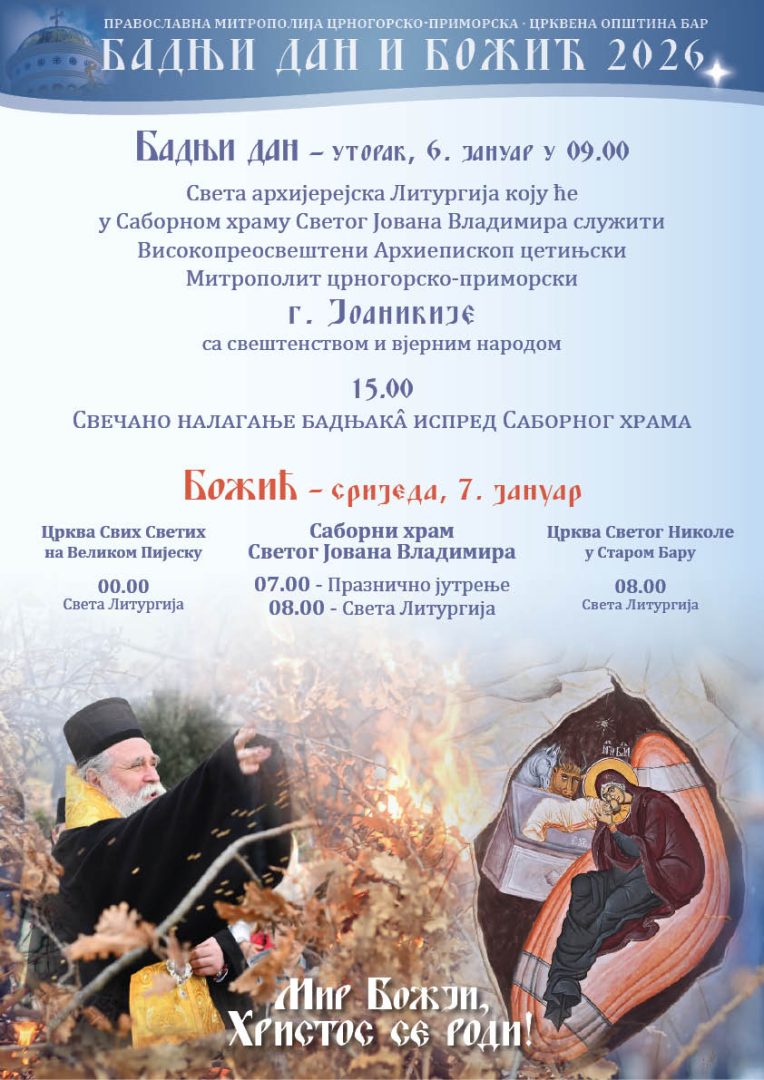 U srijedu 7. januara na praznik Rođenja Hristovog – Božić, bogosluženje u Sabornom hramu Svetog Jovana Vladimira počeće prazničnim jutrenjem u 07:00 časova. Sveta Liturgija služiće se sa početkom u 08:00 časova.